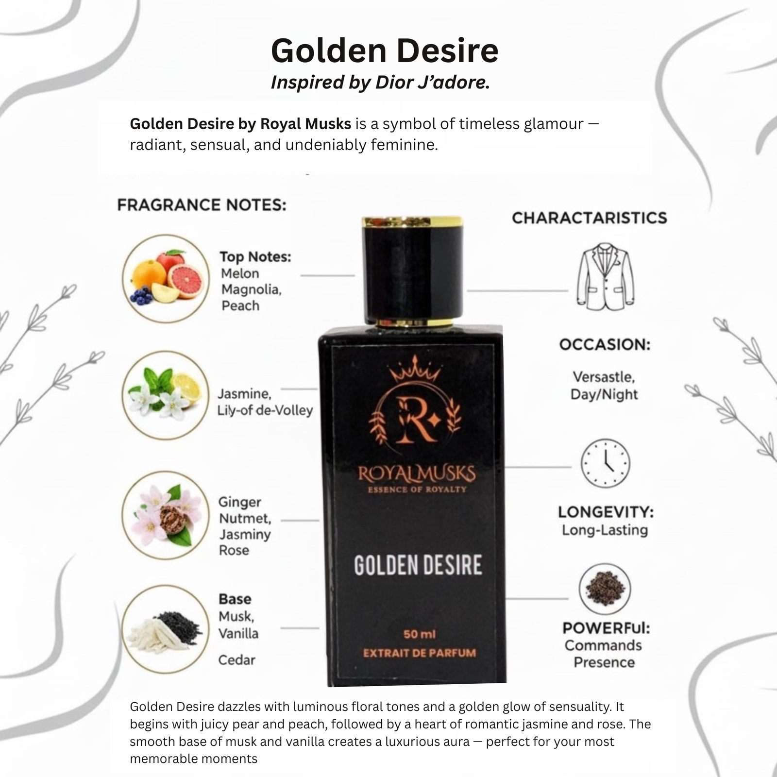 Golden Desire by Royal Musks is a symbol of timeless glamour — radiant, sensual, and undeniably feminine.